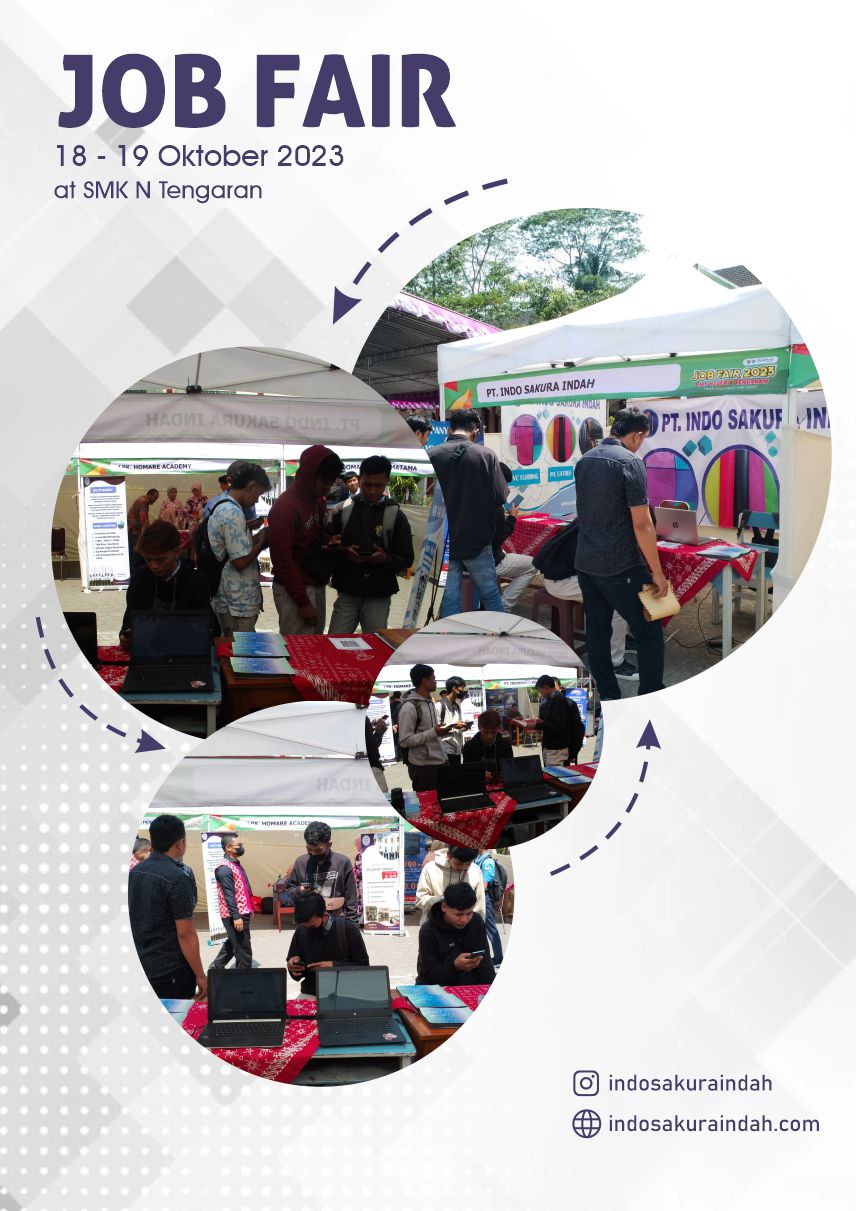 berikut keseruan dan kemeriahan acara jobfair yang diadakan di SMK Negeri tengaran. Acara tersebut di selenggarakan selama 2 hari pada tanggal 18 - 19 Oktober 2023. Selama kegiatan berlangsung, antusias dari para pencari kerja sangat besar, stand milik PT. Indo Sakura Indah terus menerus dibanjiri oleh para pencari kerja. PT. Indo Sakura Indah berterima kasih kepada penyelenggara yang telah mensukseskan acara tersebut dan sampai jumpa di lain waktu.